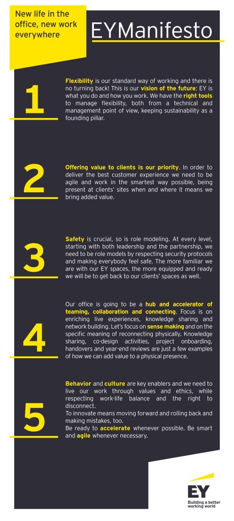 🧨 un EY Manifesto nuovo di zecca, creato assieme a tutti i colleghi, su come ci immaginiamo vivremo la nuova vita in ufficio, e il nuovo lavoro ovunque