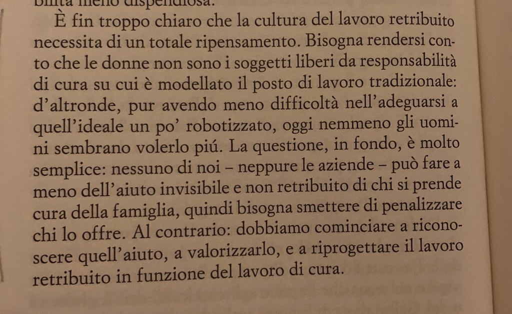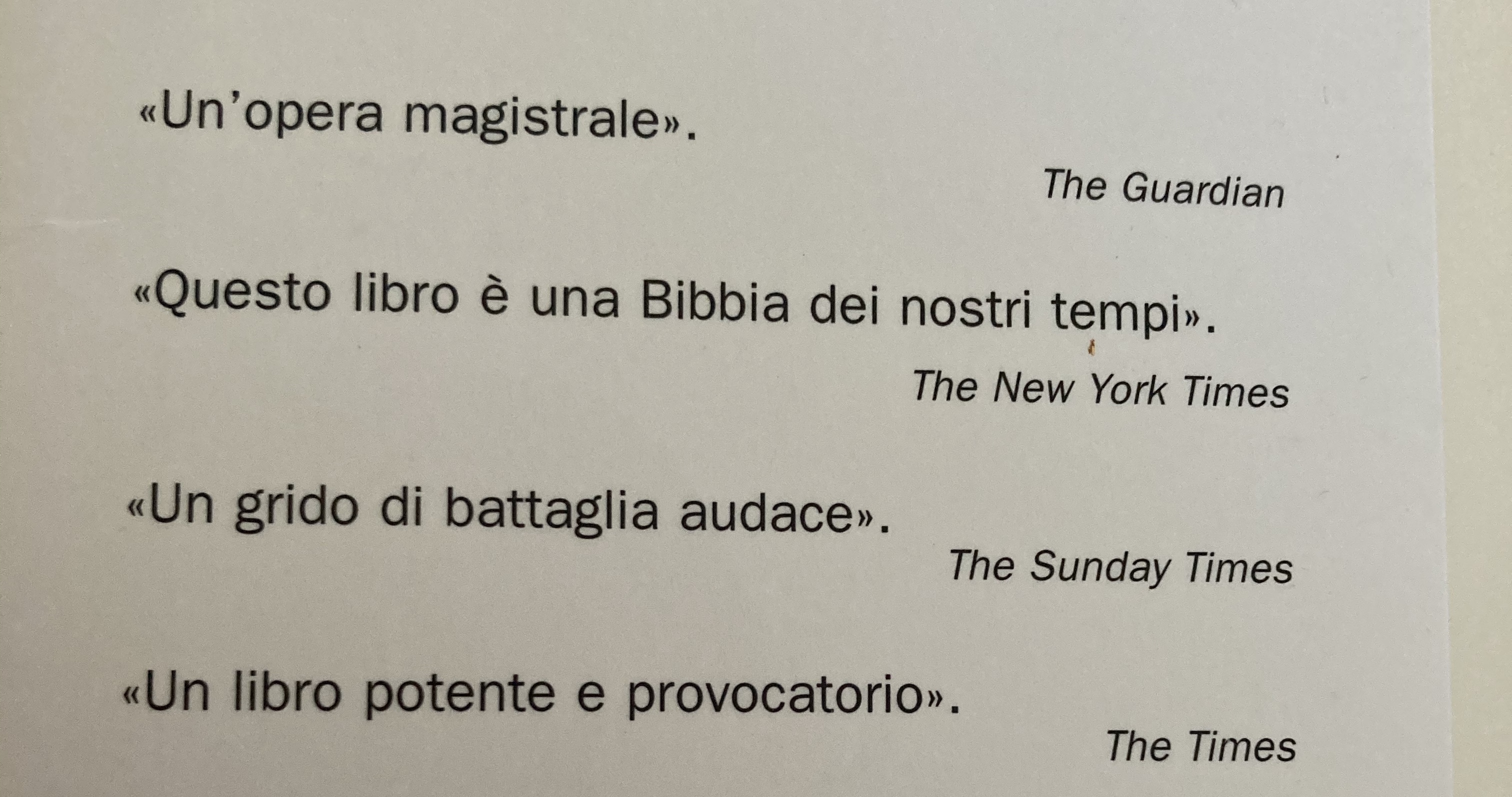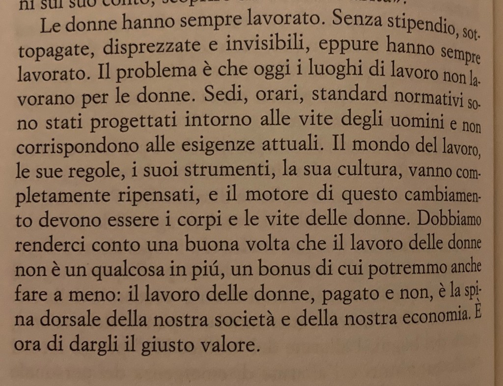 Io non penso, come sostiene il Financial Times, che “ tutti i maschi dovrebbero leggerlo”. Al contrario, proprio perché parla di attualità, tutti dovrebbero leggerlo. Certo, “se una persona non sente un certo bisogno, può non essere facilissimo convincerla che quel bisogno esiste”. Ma una consapevolezza diversa è un buon punto di partenza, specie se documentata in maniera eccellente, senza lasciarsi andare a -ismi poco efficaci o a guerre fra sessi che non portano da nessuna parte.