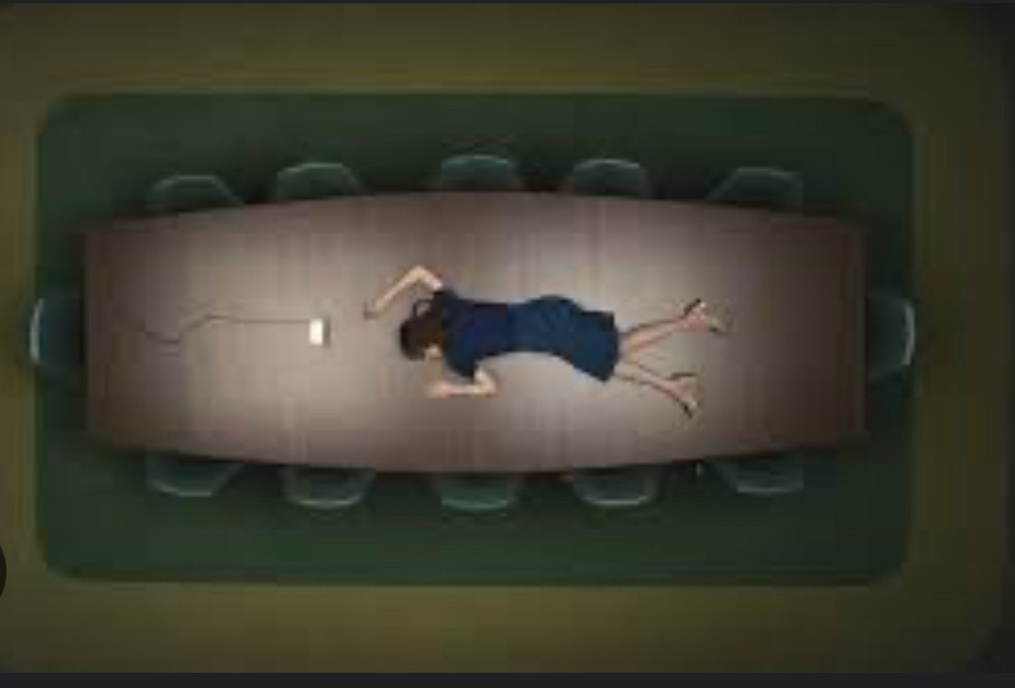 Gli ambienti e le musiche rendono ancora più claustrofobica la visione, con immensi corridoi bianchi, open space dalla moquette verde, zero finestre, un inquietante museo aziendale.