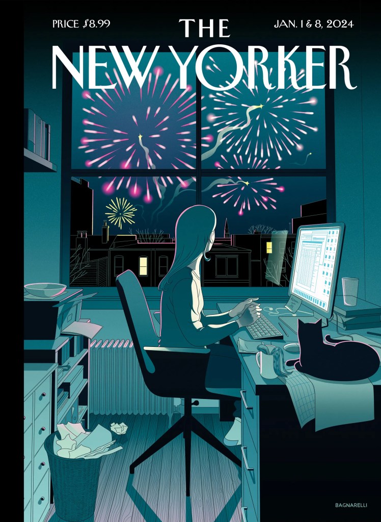 I primi giorni di questo 2024 su Linkedin sono stati dominati da un’immagine: la copertina del New Yorker, a firma dell’illustratrice italiana Bianca Bagnarelli. C’è chi ci ha letto una critica ai continui sconfinamenti vita / lavoro, chi una fotografia accurata della professione di freelance, chi un’ode all’auto-organizzazione o perfino alla solitudine nei giorni di festa comandata.