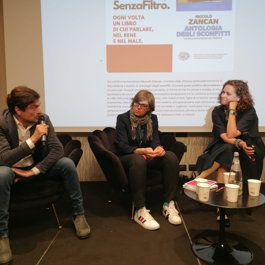 “Antologia degli sconfitti” di Niccolò Zancan, Einaudi. La foto sotto dice tutto: è stata scattata la scorsa settimana a Nobilita, il festival di cultura del lavoro e cattura il momento in cui ascoltiamo dalla sua viva voce una delle storie da lui raccolte nel libro. Una rassegna degli invisibili, persone sconfitte sul lavoro e nella vita, ritratti in maniera commovente, con un mix di registri tra poesia e cronaca,